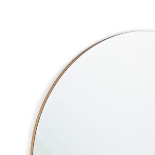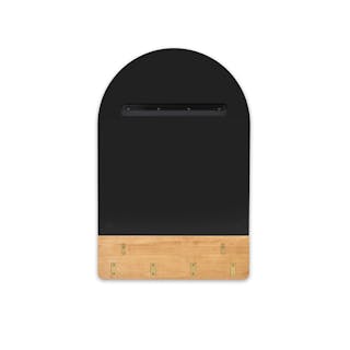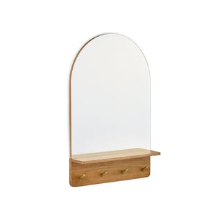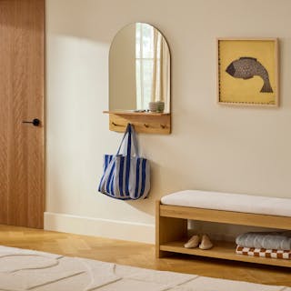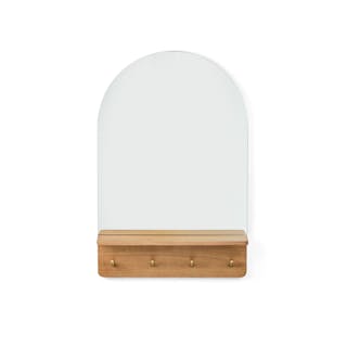 Hold it—ah, the function of the Williams shelf, so deftly described. This low-profile shelf is great for keeping your entryway clutter-free and nicely styled. Topped off with an arched mirror, you can sort those stray hairs as you run out the door, too. Made from solid wood and finished with brushed brass hooks, and finished with a not-too-big ledge to combat the urge to dump everything at the door.