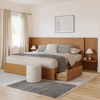 The strong, silent type. The Leif storage bed embodies the classic tropes we associate with Scandinavian good looks: tall, blond, sturdy, impeccable posture. But it's not all good looks and clean lines; it's also soft-spoken and sensitive to your (storage) needs. Featuring four soft-close drawers — two on either side, the Leif boasts some serious storage capacity. Now available with our Leif extensions included, they add a bedside table to either side while maintaining access to its ample storage. The extensions create a pleasing l-shaped wall for a cozy, cocooning effect — the perfect way to keep an open, airy vibe without sacrificing storage space.