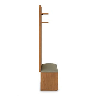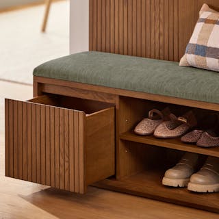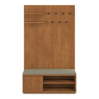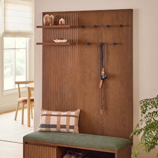 Meet Kouva. This wall panel and bench combo is refined, well-balanced, and as aesthetically pleasing as the clothing and shoes you'll store in it. With a generously padded and upholstered seat cushion, ample coat hooks, and two sizeable shelves, you'll have enough storage for even the biggest family get-togethers. Topped with a pleasing, fluted, solid-wood design, Kouva gives your entryway the glow-up it deserves.