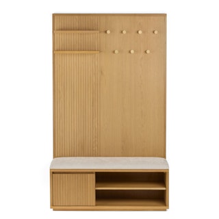 Meet Kouva. This wall panel and bench combo is refined, well-balanced, and as aesthetically pleasing as the clothing and shoes you'll store in it. With a generously padded and upholstered seat cushion, ample coat hooks and two sizeable shelves, you'll have enough storage for even the biggest family get-togethers. Topped off with a pleasing fluted solid wood design, Kouva gives your entryway the glow-up it deserves.