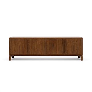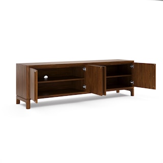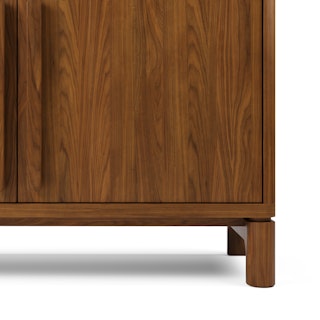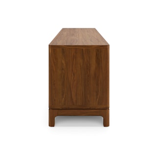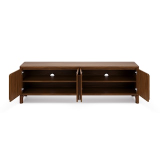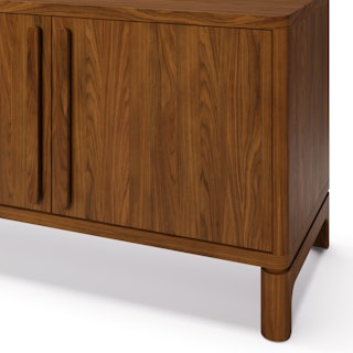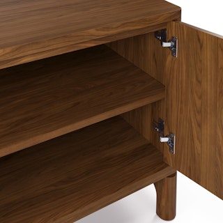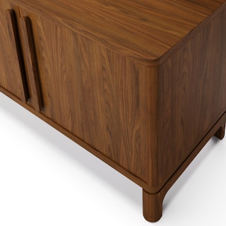 Supported by a sturdy solid walnut base, Cosgrove's angular cabinet seemingly floats above its softly rounded silhouette. Mind you, Cosgrove isn't just a pretty face — cable management holes, adjustable shelving, and soft-close doors mean Cosgrove can accommodate even the most elaborate of media setups.