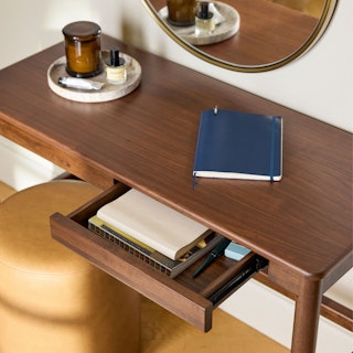 - Two slim yet spacious storage drawers with solid wood pulls