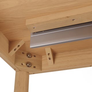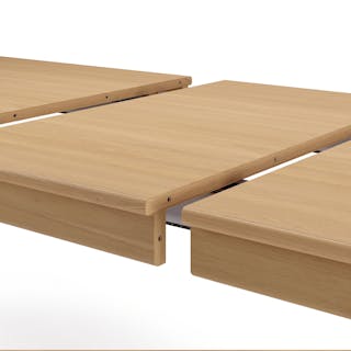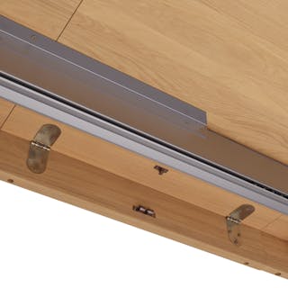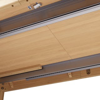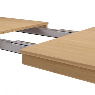 - Tabletop set atop steel runners; simply unlock the latches and pull both sides apart