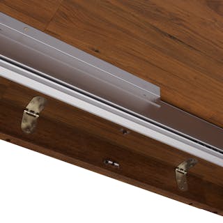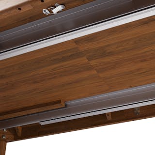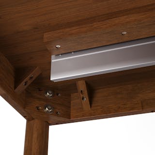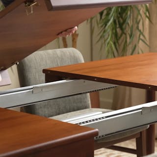 - Tabletop set atop steel runners; simply unlock the latches and pull both sides apart