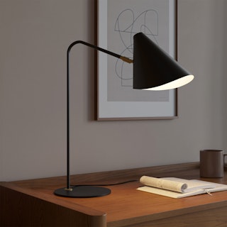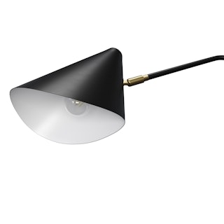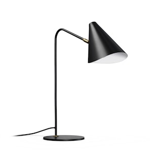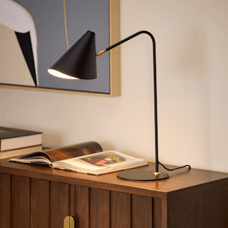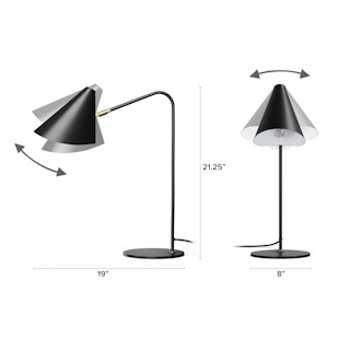 With its cone-shaped shade and sharply curved stand, Kaye draws upon the elegant characteristics of mid-century design with a modern twist. It's easily adjustable shade directs light exactly where you want it, perfect for a bedside or desk lamp. Its sleek finish combines matte black with brass accents for a classic piece of home decor.