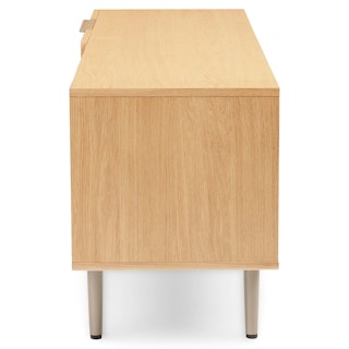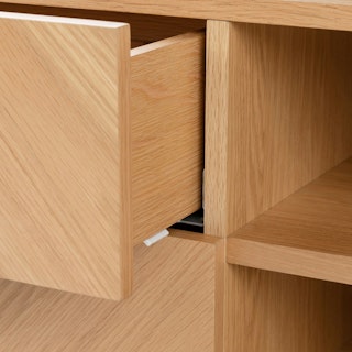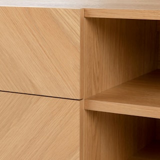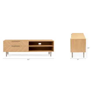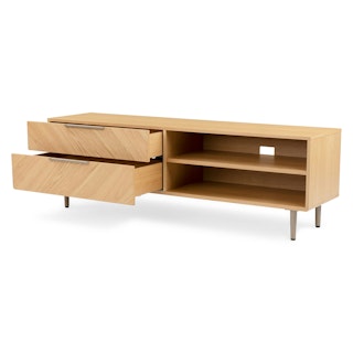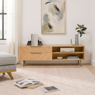 The TV might be on, but all eyes are on the Nera Media Unit. Made with veneered oak in a subtle chevron wood grain pattern, the Nera brings rich, but never stuffy, style to your space. Need a place to stash that DVD season of that small-town romance you can’t seem to part with? Two soft-close drawers are just the spot. Want to show off your smartest-looking books? There’s a fixed shelf at the perfect height so you can do just that.