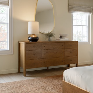 Studied simplicity. The Cassie dresser is composed of simple lines and beautiful materials. With solid wood legs, exposed end grain, and timeless bronze-colored drawer pulls, the Cassie pairs well with your vintage candlestick collection, or with your new handmade vase you brought home from the craft market.