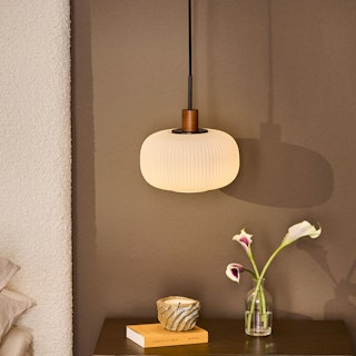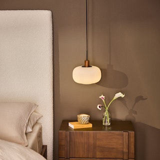 Why settle for pot lights when you can have a thoughtfully curated pendant hanging from your ceiling? With its sleek, solid wood base and statement-sized glass shade, Kipp injects a little fancy — dare we say, old money-style — into any dimly-lit room.