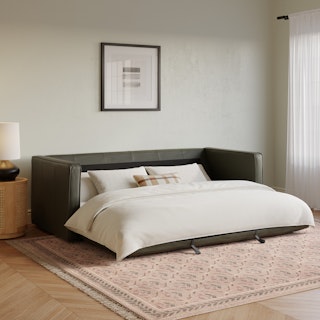 Ever looked at our best-selling Sven and thought “Huh, this thing looks so comfy, I wish they made a Sofa Bed version”. Well, dream no longer. The Sven Sofa Bed is here to make all your slumber-themed dreams come true. The Sven Sofa Bed is Indistinguishable from the rest of the collection, with its signature tufted bench seat, overstuffed cushions, and round bolsters still present. But now, simply grab the two pulls on the backside of the seat cushion and unfold the mattress for a seamless transition—Classy timeless couch to snoozeland in seconds, what's not to love?