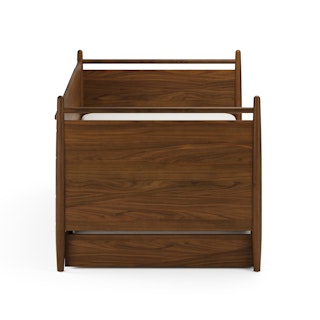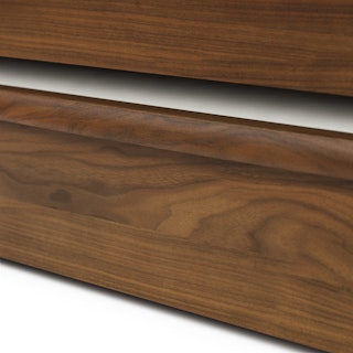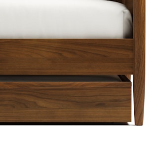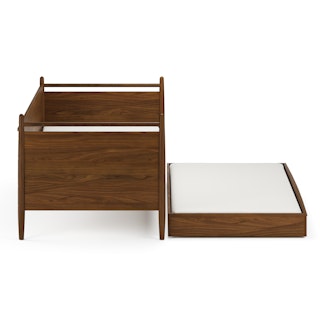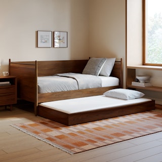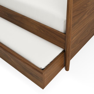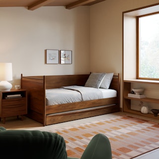 Simple pleasures. The Lenia bed draws inspiration from the Shaker school of design, featuring tapered legs, solid beech and veneered walnut, a panel headboard, concealed joinery, and an unadorned silhouette. Now available for the kids' and/or guest room, our trundle set offers versatile functionality and an elegant design, ideal for maximizing space and comfort. Sweet dreams.