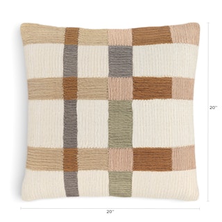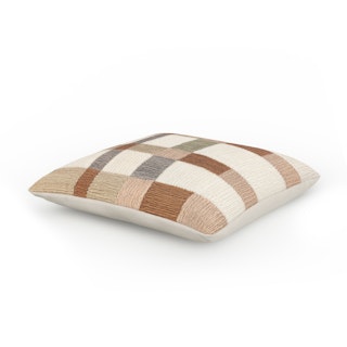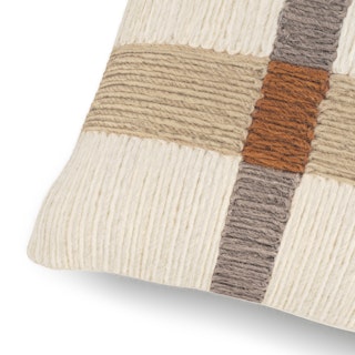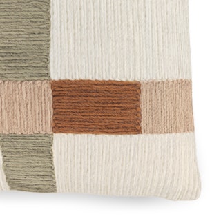 A pattern that favors the bold, the Wren pillow leans in to gallant checks and dashes. The applique weaving style gives the design a raised finish, which when combined with the earthy color story, brings an organic ease.