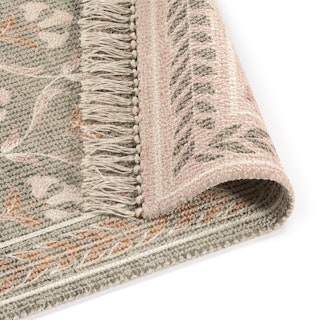 Transform the atmosphere of your home with a simple flip. Cecile features a reversible design with a rich, textured floral motif on each side: one side in Olive Green and the other in Earthy Beige — what'll it be today?