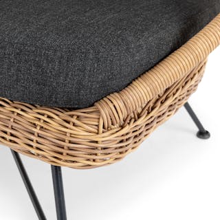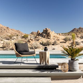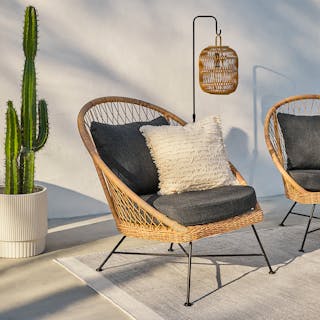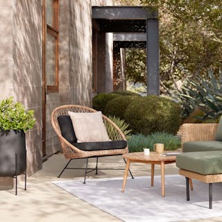 Get a little al fresco factime with your favorite person. The Aeri Lounge chairs are lthe perfect place to sit and connect with your pals, partner, or pup. Woven from matte resin wicker, set on a black metal frame, the chairs are also supremely easy to clean and care for. Same goes for the Solina: poured from terrazzo concrete, all you need is a damp cloth and 5 minutes.