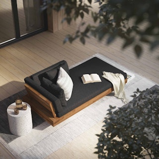 Stay a while. The Lubek chaise is built from a solid acacia wood base. The sofa is set close to the ground, encouraging you to really sink into (or even lie down on) those weather-resistant cushions. Dark cushions and super clean lines add to the Lubek’s modern look, while the warmth of the acacia wood makes the sofa easy to pair with any backyard set up. We call this look “low key modernism."