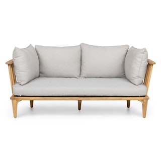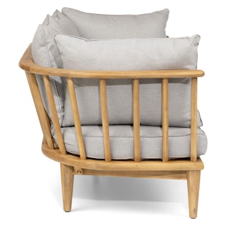 R + R, but make it cute. The Sora Loveseat is mid-century goodness in 21st century materials. A solid wood base, rounded corners, and pretty spindled back makes for an outdoor loveseat that is eye-catching but has substance — just like your summer crush. Rest on those plush cushions between sets of beach volleyball, knowing that those pillows are upholstered in weather-resistant fabric and will brush off easily. Serve!