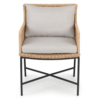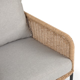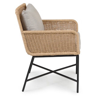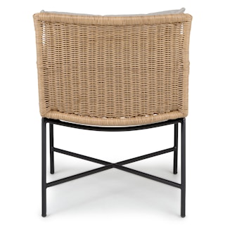 Subtle, swanky, and sleek by design. The Tody Lounge Chair doesn’t have to show off to get noticed. The slight curve of enveloping arm rests and tightly woven faux rope trim elevates the design of this classic faux wicker chair. A crisscrossed powder-coated steel frame and loose cushions upholstered in UV and stain resistant fabric add the kind of durability and contemporary finesse ideal for both outdoor and indoor dining.