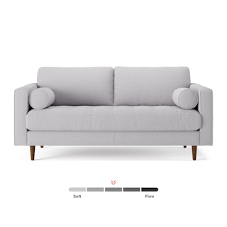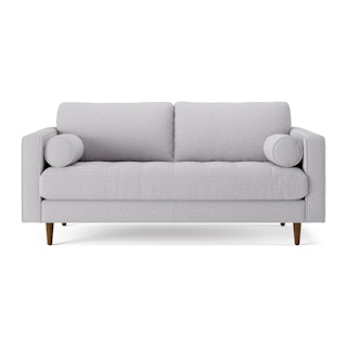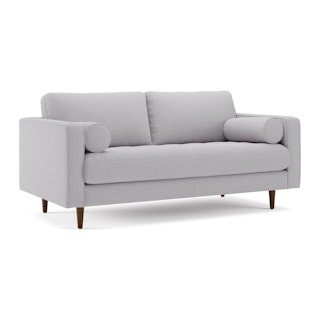 Our most popular sofa, reimagined for apartment living. This modern take on a mid-century classic features clean lines, a tufted benchseat, and luxuriously stuffed back cushions. Two matching round bolsters complete the look.