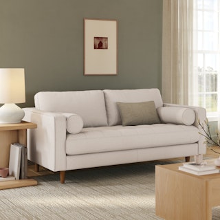 Our most popular sofa, reimagined for apartment living. This modern take on a mid-century classic features clean lines, a tufted benchseat, and luxuriously stuffed back cushions. Two matching round bolsters complete the look.