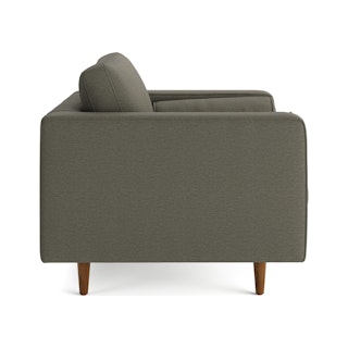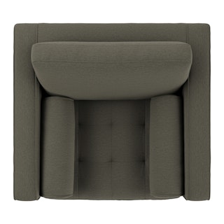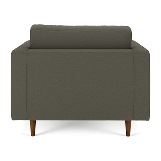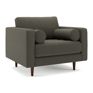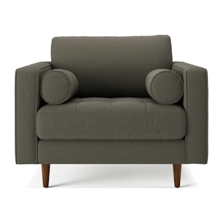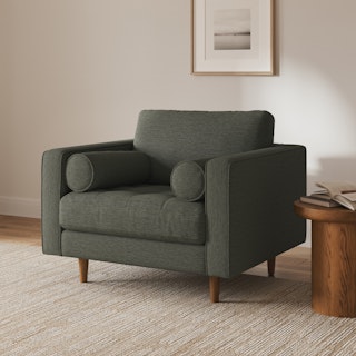 Our most popular sofa, reimagined as a large, cozy lounge chair. This modern take on a mid-century classic features clean lines, a tufted seat, and a luxuriously stuffed back cushion. Two matching round bolsters complete the look.