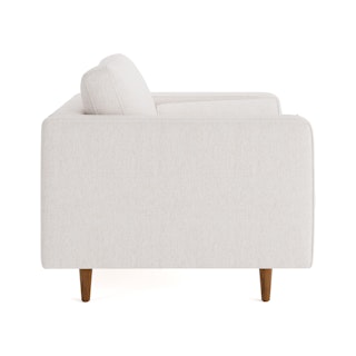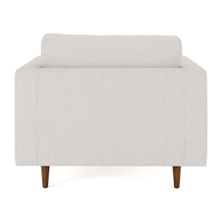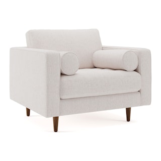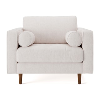 Our most popular sofa, reimagined as a large, cozy lounge chair. This modern take on a mid-century classic features clean lines, a tufted seat, and a luxuriously stuffed back cushion. Two matching round bolsters complete the look.