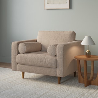 Our most popular sofa, reimagined as a large, cozy lounge chair. This modern take on a mid-century classic features clean lines, a tufted seat, and a luxuriously stuffed back cushion. Two matching round bolsters complete the look.