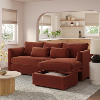 How do you want your sofa to feel? Elevated, comfortable, calm, and collected. With clean details and pleasing design heft, the Marina reversible storage sectional manages to feel at once laid-back and put together. Generously padded seats and armrests encourage long periods of meandering, while the hidden storage below the chaise can hide all kinds of goodies. Upholstered with Hale velvet, the Marina is fade-resistant, easy to clean, and anti-crush. Throw on your favorite 90s romcom and bask in a little nostalgia.