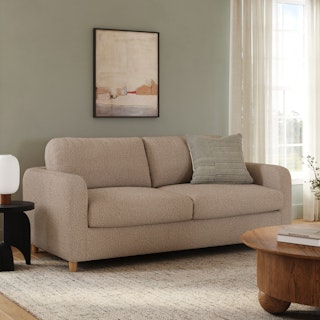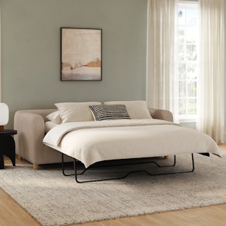 - Upholstered in a soft, non-absorptive bouclé fabric. Bouclé is an excellent choice for those who want an easy-to-care-for, style-forward sofa bed