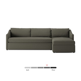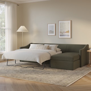 A minimal look with maximum impact... and maximum function. The Landry Sofa Bed marries laid back comfort with elegant details to produce a sofa that is as comfortable hosting movie night as it is your in-laws. Sloping sleigh-style arms and clean, straight lines make it simple to pair this sofa with many styles. With a spacious chest hidden below its chaise seat, and pull-out memory foam mattress, this sofa bed is compact, functional, and comfortable. Almost too comfortable.