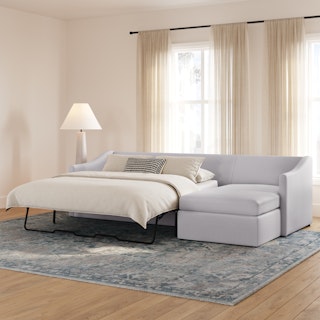 A minimal look with maximum impact... and maximum function. The Landry Sofa Bed marries laid back comfort with elegant details to produce a sofa that is as comfortable hosting movie night as it is your in-laws. Sloping sleigh-style arms and clean, straight lines make it simple to pair this sofa with many styles. With a spacious chest hidden below its chaise seat, and pull-out memory foam mattress, this sofa bed is compact, functional, and comfortable. Almost too comfortable.