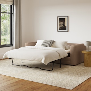 - Upholstered in a soft, non-absorptive bouclé fabric. Bouclé is an excellent choice for those who want an easy-to-care-for, style-forward sofa bed