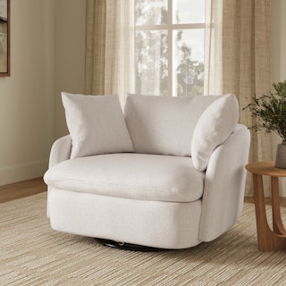 Cloud kingdom, population: you. The Leigh Grand swivel chair is the bigger brother, boasting an extra 14" in seat depth alone — nap central, we know. With thoughtful details that make it the perfect place to put your feet up and read/watch a show/stare into the middle distance. Upholstered with stain-resistant Napa fabric, the Leigh is here to help you rest easy.