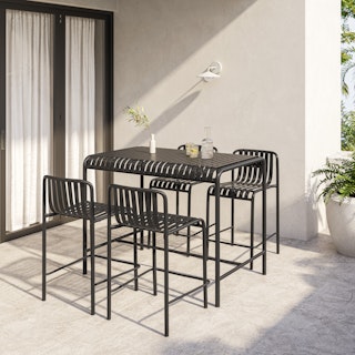 Stripes look good on everyone — but especially on this glossy, powder coated bar table. The Sarek collection is built from solid steel, kind of like Superman. Also like Superman? It’s sexy, dependable, and capable of saving your patio from the scourge of… ugly furniture.