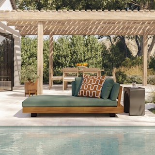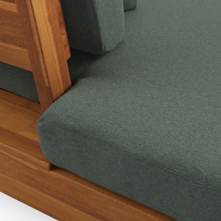 Stay a while. The Lubek chaise is built from a solid acacia wood base. The sofa is set close to the ground, encouraging you to really sink into (or even lie down on) those weather-resistant cushions. Dark cushions and super clean lines add to the Lubek’s modern look, while the warmth of the acacia wood makes the sofa easy to pair with any backyard set up. We call this look “low key modernism."