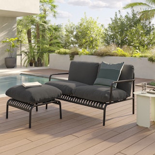 Stripes look good on everyone—but especially on this glossy, powder-coated lounge chair and ottoman bundle. The Sarek is built from solid steel, kind of like Superman. Also like Superman? The exceptional durability of Sunbrella® fabric. Lounge in peace knowing that Sunbrella® offers the highest resistance to both UV fading and inclement weather on the market. Super Sarek.