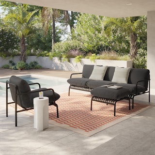 Stripes look good on everyone — but especially on this glossy, powder-coated sofa. The Sarek is built from solid steel, kind of like Superman. Also like Superman? The exceptional durability of Sunbrella® fabric. Lounge in peace knowing that Sunbrella® offers the highest resistance to both UV fading and inclement weather on the market. Super Sarek.