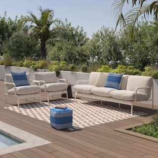 Stripes look good on everyone — but especially on this glossy, powder-coated sofa. The Sarek is built from solid steel, kind of like Superman. Also like Superman? The exceptional durability of Sunbrella® fabric. Lounge in peace knowing that Sunbrella® offers the highest resistance to both UV fading and inclement weather on the market. Super Sarek.