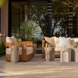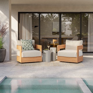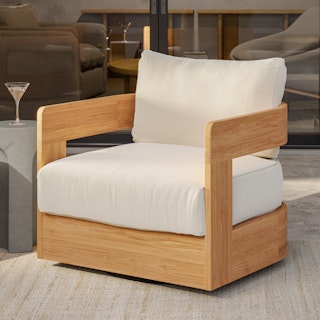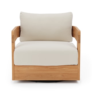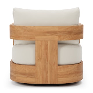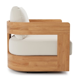 Take in a 360-degree view of your outdoor space with Pilou. With a round, wooden frame and wide arms, Pilou sits on a swivel base, ensuring no conversation is missed. Spilt drink? Don't worry—Pilou's plush, foam-filled cushions are wrapped in our UV- and water-resistant Olefin fabric. So, whether you're lounging in the sun or enjoying a conversation with friends, Pilou's neutral tones seamlessly fit into both contemporary and minimalist settings, infusing your backyard with a calm, serene aura.