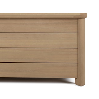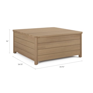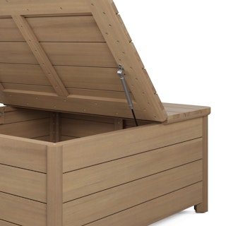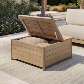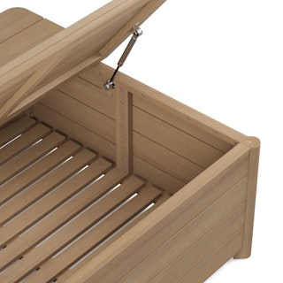 The Elise storage coffee table embodies the strategic ease we hope for every summer vacation. A slatted top opens to reveal hidden storage in the body of the coffee table — perfect for storing throw pillows, lawn games, or other backyard paraphernalia. The Elise coffee table pairs beautifully with the rest of the Elise lounge collection and a bowl of chips.