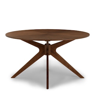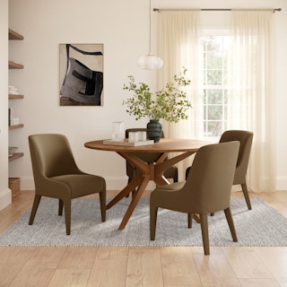 Luxurious and versatile, the Meja Dining Chair x Conan Dining Table Bundle channels the elegance of 1960s dining rooms in a contemporary way. The Meja’s gracefully curved backrest flows into mini-elbow armrests, complementing Conan’s rounded silhouette for a seamless pairing. A striking sunburst wood veneer tabletop adds a touch of glamour, while the dynamic, centered leg design provides sculptural appeal. Finished with Meja’s plush upholstered seat, you may never want to leave the dining table.