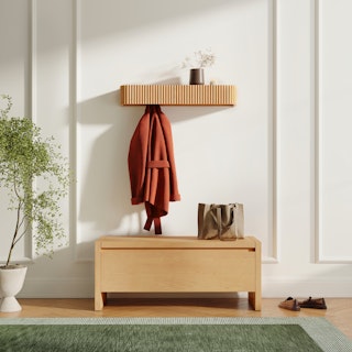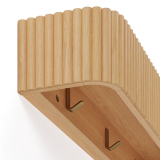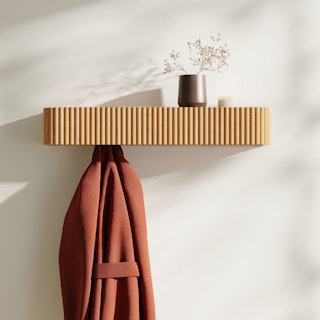 With hidden brass hooks and a fluted exterior, the Liv shelf and coat rack adds a touch of elegance to your entryway. The top tray keeps essentials like keys and wallets easily organized, while the discreet hooks beneath the shelf provide a tidy and stylish spot for coats and bags. Whether you're making a statement or just organizing your entryway, Liv will be a calming presence when the movie starts.
