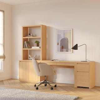 The Leif Modular Desk x Bookcase Bundle embodies the classic tropes we associate with Scandinavian good looks and functionality for your home office. Enjoy the Leif desk’s impeccable posture and sturdy build, and thoughtful features like two soft-close drawers and an integrated cable management cutout to keep your workspace tidy. Paired with the Leif Modular Bookcase—equipped with two soft-close doors, an adjustable interior shelf, and a storage cable management cutout to keep those messy cables organized—this bundle ensures your space stays organized, stylish, and perfectly coordinated.