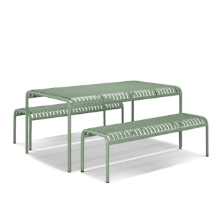 - Set includes two benches and dining table