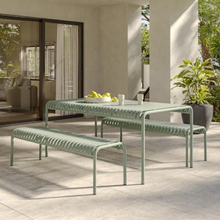 Stripes look good on everyone — but especially on this glossy, powder coated dining table set. The Sarek is built from solid steel, kind of like Superman. Also like Superman? It’s sexy, dependable, and capable of saving your patio from the scourge of… ugly furniture.