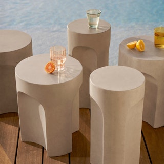Compact with subtle curve details, the Noah side and drinks tables bring playful functionality to outdoor spaces. We've paired them together to play with dimension and height (and to make more room for snacks).