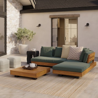 Stay a while. The Lubek sectional is built from a solid acacia wood base. The sofa is set close to the ground, encouraging you to really sink into (or even lie down on) those weather-resistant cushions. Dark cushions and super clean lines add to the Lubek’s modern look, while the warmth of the acacia wood makes the sofa easy to pair with any backyard set up. We call this look “low key modernism."