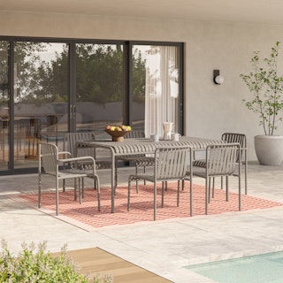 The Lecano's striking linear design brings a sense of play without sacrificing visual order. Woven from weather-resistant polypropylene, the Lecano is the perfect summer companion for your outdoor lounging set-up.