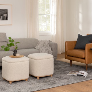 Holds your feet and your stuff. The Maribo Ottoman, with its soft-close lid and ample storage space, is a stylish double-threat.