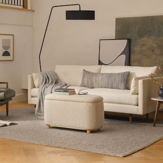 - Upholstered in a soft, non-absorptive bouclé fabric. Bouclé is an excellent choice for those who want an easy-to-care-for, style-forward sofa