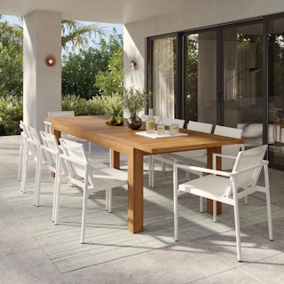 Carefully curated to elevate your outdoor dining area, this bundle brings timeless style and versatility. The Avalon Extendable Dining Table, crafted from solid acacia wood with a rustic weathered finish, is sturdy, reliable, and beautiful—offering ample space for any gathering with its extendable design. Paired with the Tola chair in timeless black, made from powder-coated steel and Textilene fabric, this set is designed to withstand the elements while remaining stackable and stylish. Whether hosting a lively dinner party or relaxing with coffee outdoors, this bundle ensures lasting comfort and elegance for years to come.