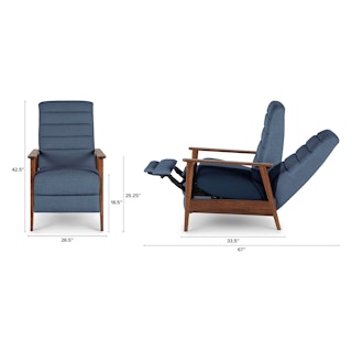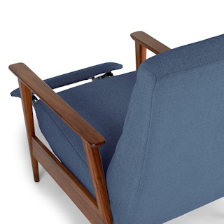 A master of disguise, the Ellow Recliner effortlessly transforms from a mid-century modern lounge chair to a deluxe recliner. Made with high density foam filling and solid walnut legs, the Ellow features a 3-point push back reclining mechanism that gives you more control over the way you lounge. All the way back for your afternoon nap, partially-reclined for a relaxed game show marathon, or fully upright when you’ve got company — the choice is yours.